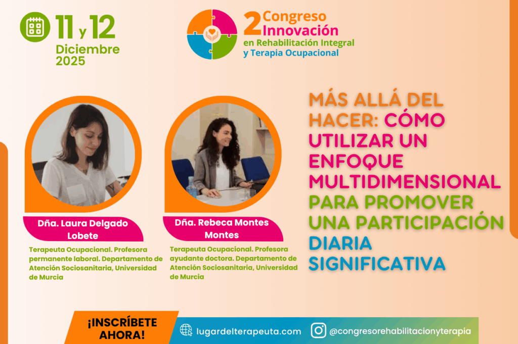 Esta ponencia, titulada Más allá del hacer: cómo utilizar un enfoque multidimensional para promover la participación diaria significativa, llevada a cabo por la Dra. Laura Delgado Lobete y por la Dra. Rebeca Montes Montes, Terapeutas Ocupacionales. Profesoras en la Universidad de Murcia. Departamento de Atención Sociosanitaria; es una invitación a todos los profesionales de la rehabilitación a repensar su práctica y a integrar el significado en cada intervención. Si buscas herramientas para diseñar estrategias terapéuticas orientadas a la promoción de la salud que impacten en la esencia de la vida diaria, y no solo en la función física, te esperamos. Descubre cómo una comprensión profunda de la ocupación puede transformar los resultados en salud mental y física.