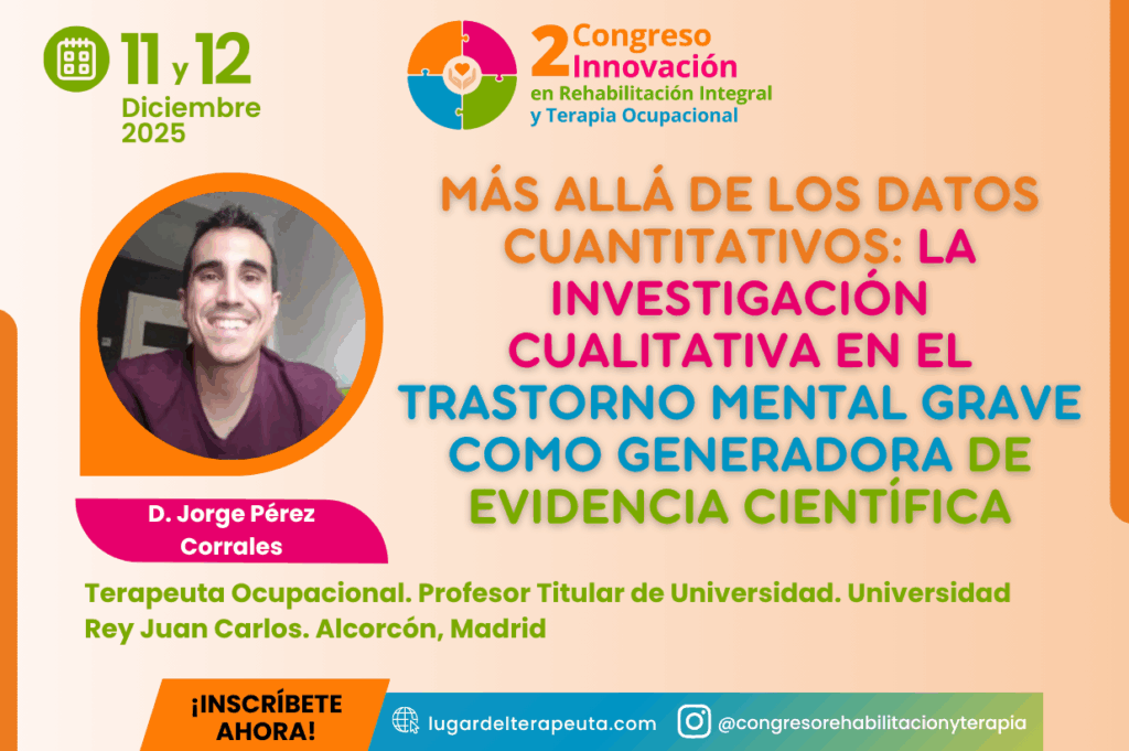 Si eres un profesional, investigador o gestor sanitario que busca una comprensión integral y ética del Trastorno Mental Grave, no puedes perderte esta ponencia titulada “Más allá de los datos cuantitativos: la investigación cualitativa en el trastorno mental grave como generadora de evidencia científica”, en la cual tendremos el placer de escuchar al Dr. Jorge Pérez Corrales, Terapeuta Ocupacional. Profesor Titular de Universidad. Universidad Rey Juan Carlos. Alcorcón, Madrid. Descubre cómo la investigación cualitativa no es una opción secundaria, sino una generadora primaria de evidencia científica indispensable para implementar el Modelo de Recuperación. Ven a conocer los métodos que están dando voz a las experiencias más silenciadas.¡Inscríbete en el II Congreso de Innovación en Rehabilitación Integral y Terapia Ocupacional y sé parte de la revolución que pone la experiencia humana en el centro de la ciencia!