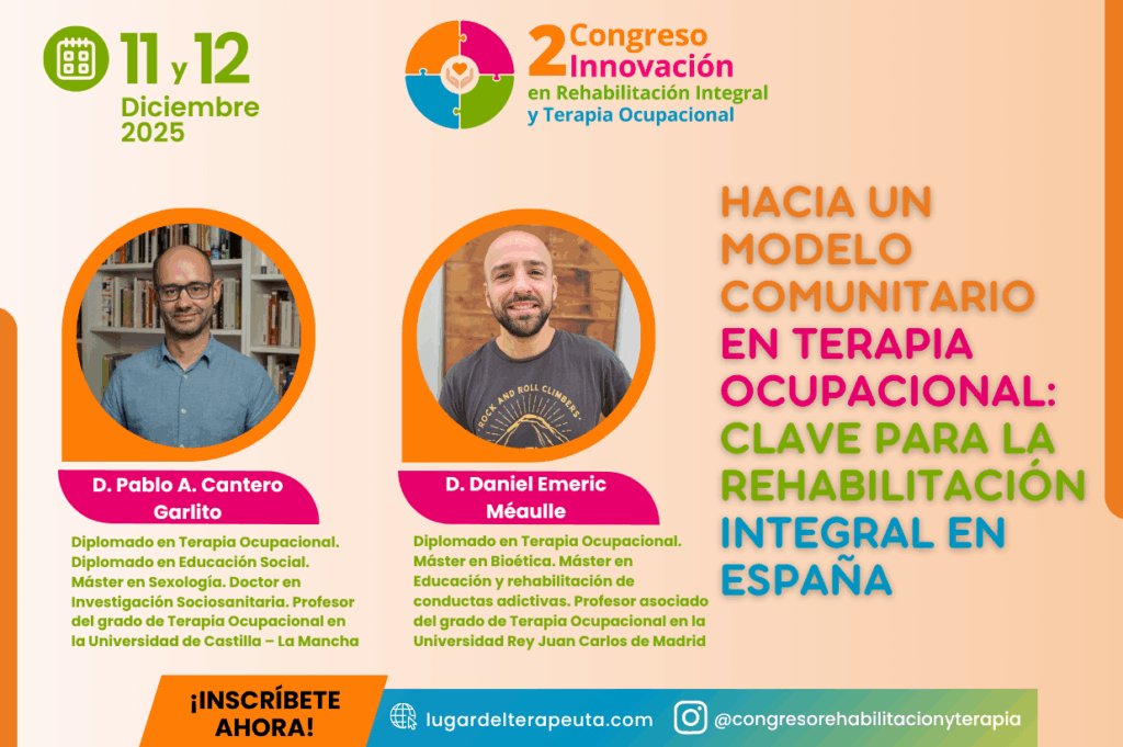Todo esto y más será abordado en la ponencia Hacia un modelo comunitario en Terapia Ocupacional: clave para la rehabilitación integral en España, llevada a cabo por el Dr. D. Pablo A. Cantero Garlito (Diplomado en Terapia Ocupacional. Diplomado en Educación Social. Máster en Sexología. Doctor en Investigación Sociosanitaria. Profesor del grado de Terapia Ocupacional en la Universidad de Castilla – La Mancha) y D. Daniel Emeric Méaulle (Diplomado en Terapia Ocupacional. Máster en Bioética. Máster en Educación y rehabilitación de conductas adictivas. Profesor asociado del grado de Terapia Ocupacional en la Universidad Rey Juan Carlos de Madrid). Su ponencia constará de los siguientes puntos: